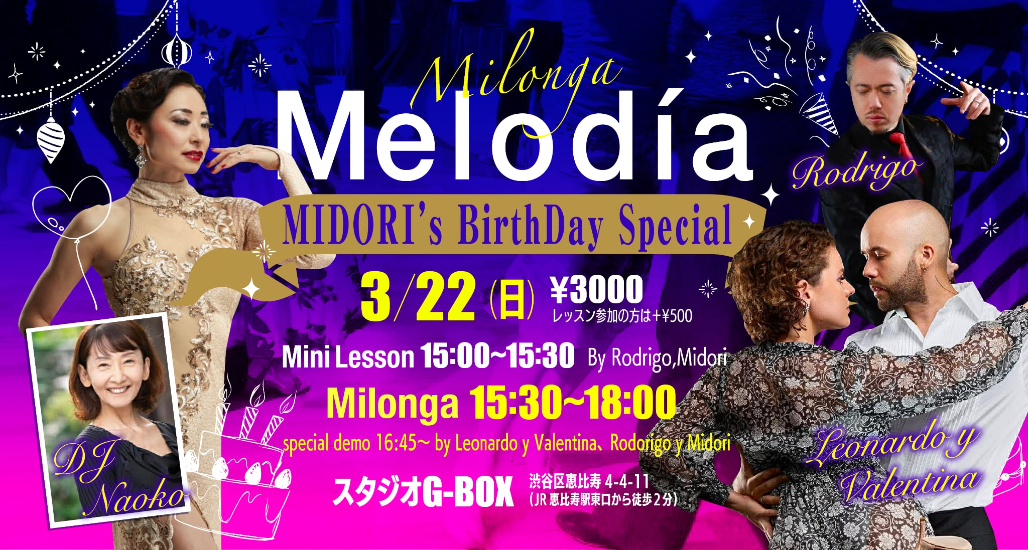 2026年3月22日(日)のミロンガメロディアは! MIDORI Birthday Special という事で、豪華に Leonardo & Valentina とRodrigo先生をお呼びして。 […]